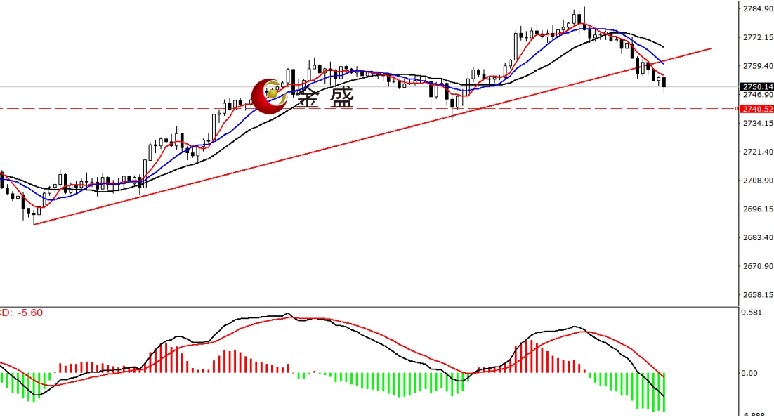 现货黄金周一(1月27日)开市于2771.23美元/盎司,亚欧盘时段,美指小幅高开高走,午后承压有所回落。黄金震荡下行,盘中接连跌破多个整数关口,多头回吐上周五全部涨幅。截止目前,金价最高2772.36美元/盎司,最低2747.23美元/盎司。黄金逼近前高2790美元一带,周内看这一带的真假破位。日内行情持续调整,表明多头有获利了结现象。价格跌破上周的加速上行趋势线,多头力度或出现转折,短期看2740美元一带的支撑,操作上低吸为主。