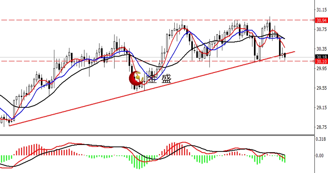前一个交易日,白银延续区间震荡,价格先涨后调再次承压31美元大关,最终收涨0.53%。今天白盘行情延续下行,价格来到区间下轨附近。四小时周期,均线系统收敛向下拐头,压制价格反弹。MACD指标快慢线在零轴上方现死叉,做空的动能增强。白银维持偏弱走势,价格回落至图示的趋势线附近。行情30—31区间盘整逾十天,短期走出方向的概率加大。一旦价格跌破30美元大关,则行情将震荡下行。