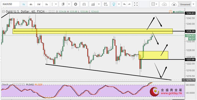 现货黄金周三(2月15日)亚盘和欧盘小幅震荡下行,美盘开始快速拉升。上方关注1236美元/盎司附近的阻力,向上不破可以轻仓尝试做空。下方依然关注1223美元/盎司上方的支撑。若正是下破1223美元/盎司,则下方需要看到下方趋势线支撑附近。