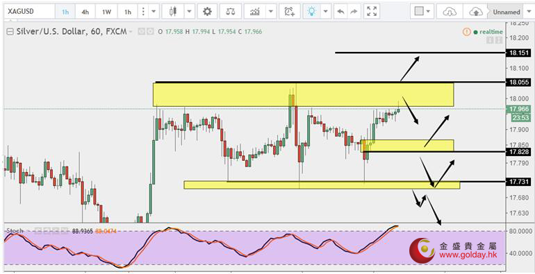 现货白银周三(2月15日)亚盘和欧盘小幅震荡下行,美盘冲高震荡上行。上方关注18.00-18.05美元/盎司区间的阻力,若突破则还有上行空间。下方关注17.80和17.73美元/盎司的支撑,回落获得支撑可以做多,以目前的情况,只有下破17.73美元/盎司才能认为白银转为空头。