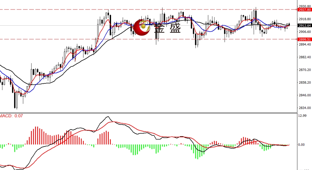前一个交易日,美国二月非农就业人数不及预期,美指继续下行收阴。黄金继续2900美元上方震荡,当日波动逾三十美金,最终收十字星。今天白盘行情延续震荡,市场波动率有所下降。小时周期,均线系统收敛走平,价格围绕其震荡。MACD指标快慢线在零轴附近运行,做空的动能减弱。黄金自2950美元调整以来,下行的持续性不佳。行情围绕2900—2930区间盘整三日,短期关注突破方向,操作上调整做多为主。
