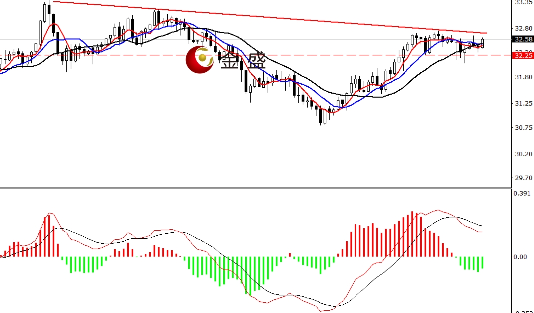前一个交易日,白银震荡偏调整,价格运行在32美元上方,最终收跌0.31%。今天白盘行情延续窄幅休整,多头受制于32.6美元一带。四小时周期,均线系统收敛走平,价格围绕其震荡。MACD指标快慢线在零轴上方现死叉,做空的动能为主。白银周线形成阳包阴结构,之前的看跌反转信号被破坏,价格该调不调,可能还要上行。上周行情反弹三日,随后横盘两天,32美元一带形成震荡区间下轨,短期看32—32.8区间整理,操作上回调做多为主。
