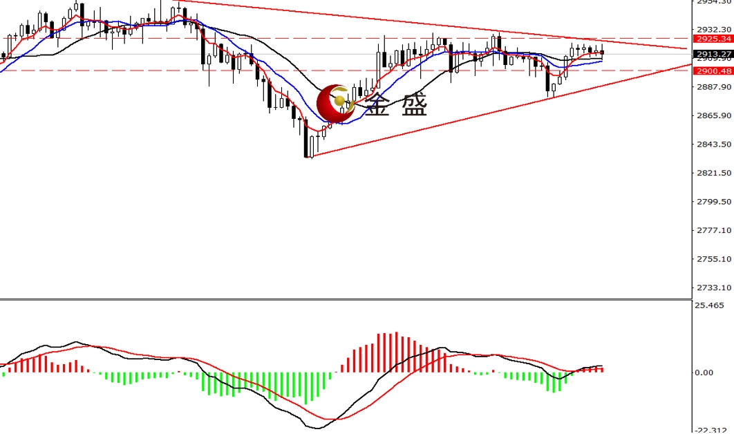 前一个交易日,美指下行格局不变,盘中再创新低逼近103美元一带。黄金单边上涨,多头收复周一全部跌幅,当日波动逾四十美金,最终收涨0.97%,日图形成阳包阴。今天白盘行情延续昨日美盘的区间盘整,价格运行在2910美元上方,多头维持强势表现。四小时周期,均线系统收敛走平,价格围绕其震荡。MACD指标快慢线在零轴下方现金叉,做多的动能为主。前两日黄金形成V型反转,之前的盘整区间2900—2930确认向下变盘失败。行情向下突破无果,后市或寻求向上突围。操作上调整做多为主。