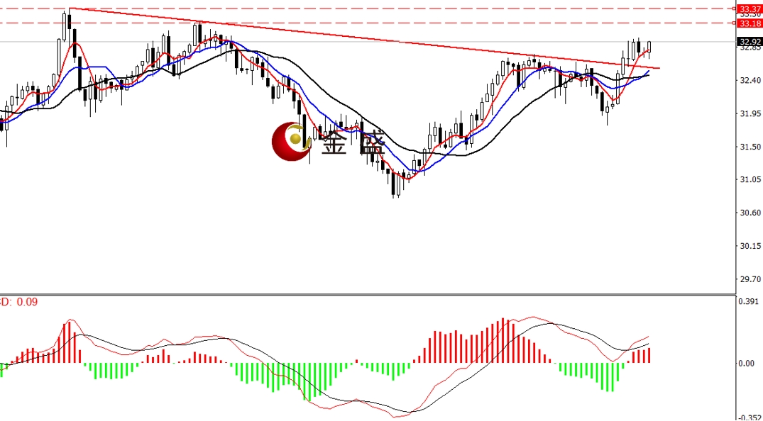 前一个交易日,白银走势与黄金同步,但多头力度更为强劲,行情全天单边上涨至33美元一带,最终收涨2.67%。今天白盘走V字型,价格盘中小幅调整,午后收复日内全部跌幅,一小时拉升近1%。四小时周期,均线系统拐头向上,对价格上行构成支撑。MACD指标快慢线在零轴上方现金叉,做多的动能为主。白银延续反弹,价格突破图示的高点压力线。短期关注前高一带的压力,操作上调整做多为主。