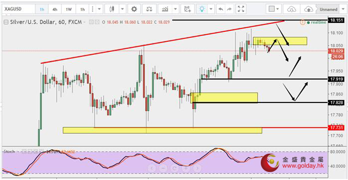 现货白银周四(2月16日)亚盘和欧盘震荡上行,美盘延续上行走势。上方关注趋势线及前高附近的阻力,若突破则还有上行空间,但短周期我们认为存在回调的概率,突破趋势线的概率不大。下方关注17.80和17.92美元/盎司的支撑,回落获得支撑可以做多。现在可以把白银看作一个大的三角形震荡,以上方趋势线和17.70的支撑为区间。