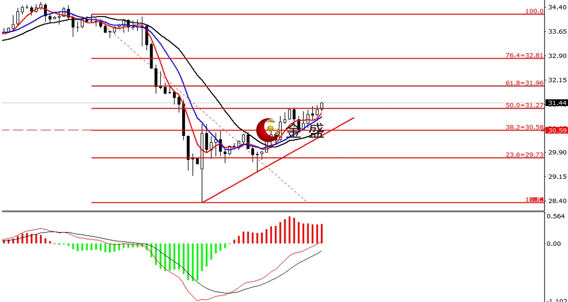 前一个交易日,白银跟随黄金反弹,行情先跌后涨走V字型,多空围绕31美元关口,最终收涨0.67%。今天白盘行情延续缓慢攀升,价格继续刷新周内新高。四小时周期,均线系统拐头向上,对价格形成支撑。MACD指标快慢线零轴下方现金叉,做多的动能为主。白银自28.3美元一带开始的反弹在延续,价格突破盘整区间,确认反弹空间加大,多头力度缓慢增强。多头收复上周一半跌幅,价格继续上行面临的抛压将加大。短期关注反弹的持续性,价格一旦受阻或迎来调整。