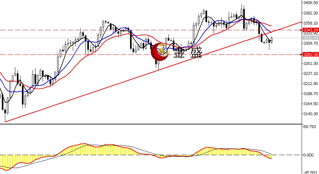 现货黄金周一(6月9日)开市于3311.57美元/盎司,亚欧盘时段,美指承压日图短期均线震荡下行,午后跌破99美元大关,多头回吐非农当日大部分涨幅。黄金先跌后涨走V型反转,盘中短暂失守3300美元关口。截止目前,金价最高3328.23美元/盎司,最低3293.6美元/盎司。四小时周期,黄金自3120美元开始的上行趋势未变,但价格跌破上涨支撑线,即多头力度减缓,趋势多空分水岭在3280美元一带。日内价格走尖底结构,上方压力区看3340美元一带。短期看震荡,操作上高抛为主。