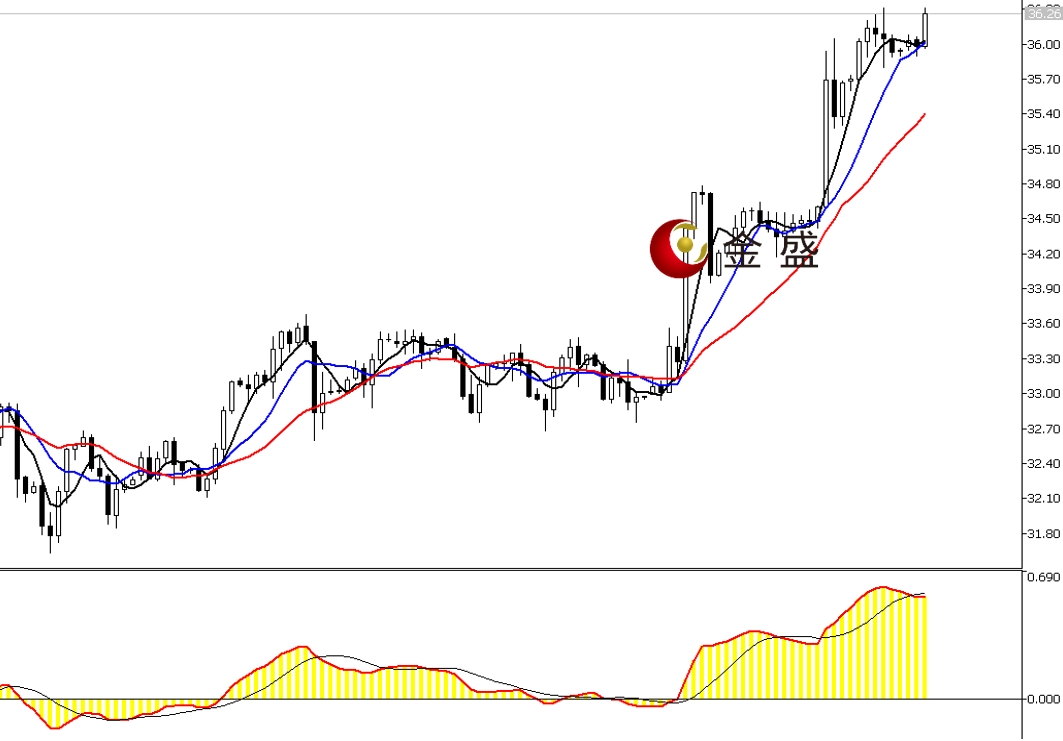 前一个交易日,金银走势分化,白银延续涨势,多头围绕36美元关口徘徊,最终收涨0.9%。今天白盘银价延续强势上涨,午后刷新上周高点。四小时周期,均线系统拐头向上,对价格上行构成支撑。MACD指标快慢线零轴上方有死叉迹象,做多的动能减弱。白银上周涨幅近9%,今天再度新高,短期涨幅偏大,指标出现超买现象。行情出现加速走势,谨防多头盛极而衰,短期关注新高后调整的力度,操作上不宜追涨,回调做多为主。