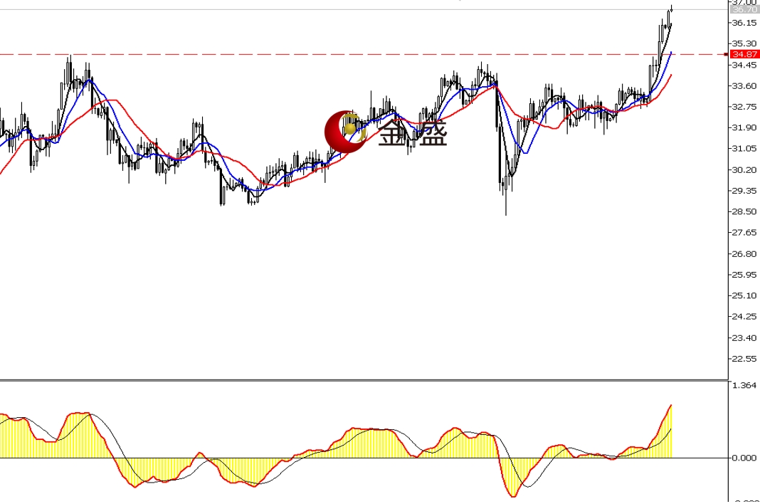 前一个交易日,早盘时段,白银多头延续强势,价格围绕36美元关口横盘休整,盘中最低至35.9美元。欧美盘时段,行情震荡上行,价格突破多个关口,尾盘创日内高点36.87美元,最终收中阳线。均线系统多头排列,运行在价格下方形成支撑。MACD指标快慢线零轴附近现金叉,做多的动能增强。白银日图三连阳,且昨日阳线实体反包前两日的上影线,多头动能有再度增强的迹象。行情短期涨幅偏大,不宜追涨,操作调整做多为主。