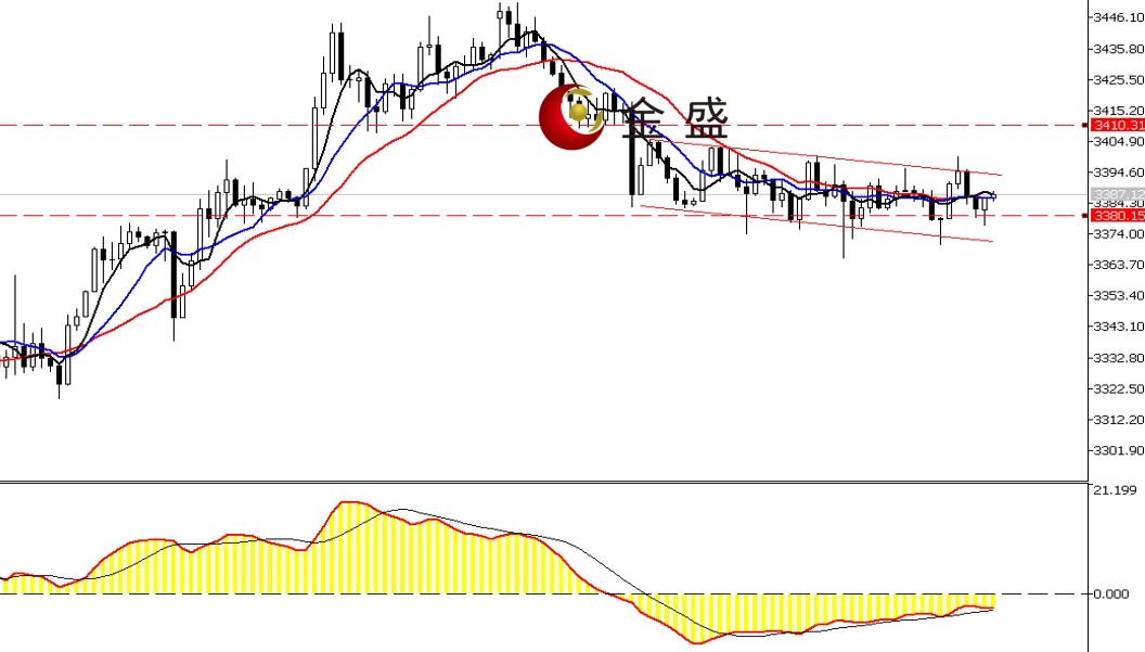 现货黄金周三(6月18日)开市于3388.11美元/盎司,亚欧盘时段,美指承压日图布林带中轨有所调整,多头回补昨日一半涨幅。黄金延续昨日的区间内徘徊,价格承压3400美元关口。截止目前,金价最高3399.76美元/盎司,最低3370.54美元/盎司。中东局势依然紧张,有传言美国有可能参战让战火进一步升级,但避险对黄金的提振力度在减弱。行情震荡形成下行通道,短期关注3380—3400区间如何打破。价格不能持续站稳3400美元大关,则偏向震荡下行。明天凌晨美联储将公布利率决议,市场波动或加剧。