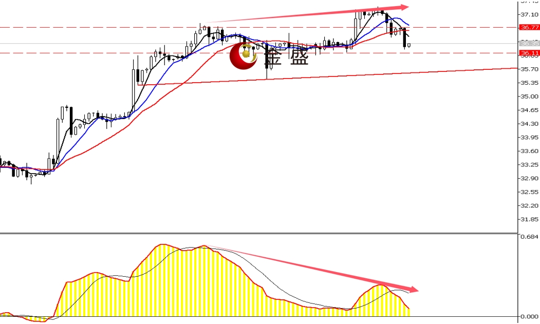 前一个交易日,白银先涨后跌走倒V字型,晚盘失守37美元关口加速走低,最终收跌1.16%。今天白盘行情延续下行,午后逼近36美元大关,周内涨幅悉数回吐。四小时周期,均线系统不断收敛,运行在价格上方形成压制。MACD指标快慢线零轴上方现死叉,做空的动能增强,指标顶背离确认要调整。白银上涨趋势不变,但价格刺破前高36.8美元一带后深度调整,即确认U型结构突破无效。上行趋势中出现空头力度增强的现象,行情将进入高位的震荡,短期关注36—35.8区间的支撑,操作上高抛低吸。