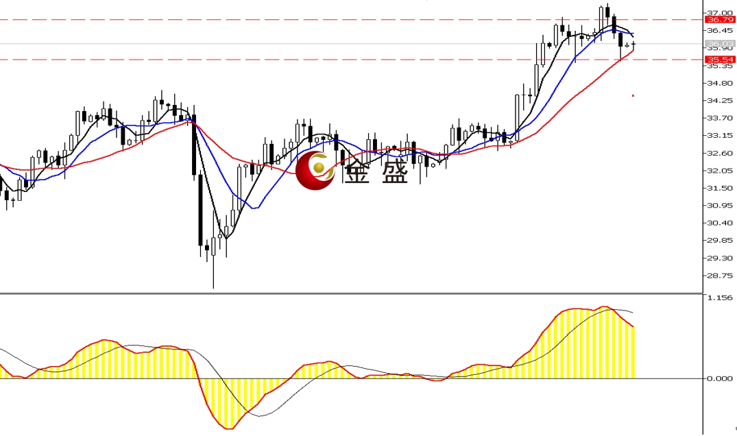 前一个交易日,早盘时段,白银开市即创当日高点36.42美元,随后出现跳水走势,一小时走低逾0.6美金。午后创日内低点35.49美元并有所反扑。晚盘时段,行情围绕36美元关口横盘休整为主,日图收有下影线的阴K。均线系统偏多头排列,价格回踩布林带中轨。MACD指标快慢线零轴上方现死叉,做空的动能为主。白银涨势不变,但价格新高后连续多日调整,确认37美元上方压力明显。周线连续出现长上影线,短期看高位震荡,操作上高抛低吸。