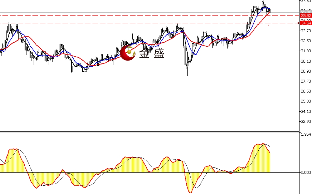 前一个交易日,早盘时段,黄金受避险资金推动宽幅震荡,白银表现平稳,价格围绕36美元关口横盘休整,午后价格重心有所上移。晚盘时段,行情延续反弹,盘中最高至36.35美元,尾盘避险降温,白银跟随黄金下行,最终收小阳星。均线系统偏多头排列,价格回踩布林带中轨。MACD指标快慢线零轴上方现死叉,做空的动能为主。白银涨势不变,行情进入高位休整。即使近期避险情绪扰乱金融市场,但白银表现平稳,延续自身的走势节奏。短期看35.5—36.5区间震荡,操作上高抛低吸。