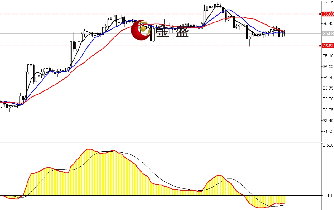 前一个交易日,金银走势有所分化,黄金受避险影响,走势上蹿下跳。白银围绕36美元关口先涨后跌,最终收涨0.14%。今天早盘避险降温,白银跟随黄金跳水,开市一小时走低0.5美金,但随后持续反扑,午后刷新当日高点。四小时周期,均线系统不断收敛,布林带中轨运行在价格上方形成压制。MACD指标快慢线零轴下方走平,做空的动能衰竭。白银上涨趋势不变,当前进入大涨后的调整周期。避险情绪的升降对白银的影响偏弱。今天日内黄金持续下挫,白银是震荡上行。金银走势再次进入分化,但最终方向会趋同。短期先关注35.5—36.5区间震荡。