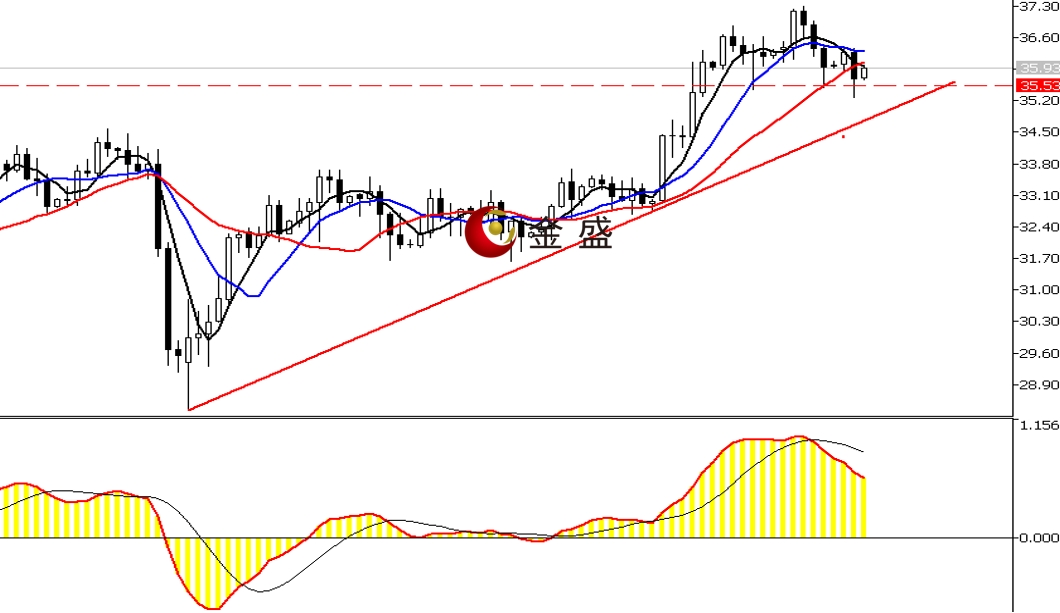前一个交易日,早盘时段,中东局势转好打压避险情绪,白银跟随黄金跳水,但很快收复全部跌幅。午后价格围绕36美元关口横盘,并创日内高点36.18美元。晚盘时段,行情再次跳水,盘中一小时跌幅2%,价格最低至35.27美元,尾盘连续小阳星反抽,最终收长下影线的阴K。均线系统偏多头排列,价格回踩布林带中轨。MACD指标快慢线零轴上方现死叉,做空的动能为主。白银涨势不变,价格形成图示的趋势线。短期行情进入高位休整,昨日价格一度跌破区间下轨35.5美元,但随后快速收复,即确认其支撑依然有效。短期看35.5—36.5区间震荡,操作上高抛低吸。