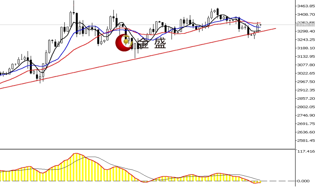 前一个交易日,白盘时段,黄金依托三千关口震荡上行,午后涨势加剧,小时图出现连阳走高,价格接连突破多个压力位。晚盘时段,行情涨势减缓,多空围绕3350美元一带争夺,盘中最高至3357.69美元,尾盘有所调整,最终收阳线。均线系统收敛走平,布林带中轨对价格上方形成阻碍。MACD指标快慢线零轴上方现死叉,做空的动能减弱。黄金年内形成图示的趋势线,价格盘中虽有刺破,但近两日连阳反扑,K线重新站稳其上方。短期看3350美元一带的压力,不能有效突破,则偏向3300—3350区间震荡。
