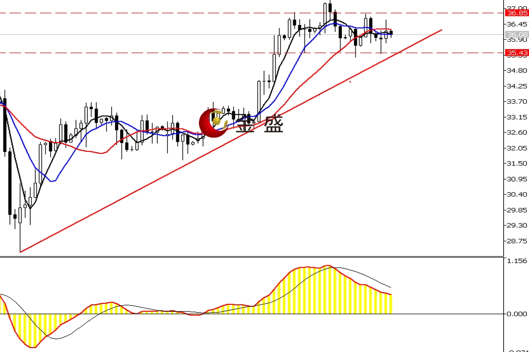 前一个交易日,白盘时段,银价早盘短暂跳水至日内低点35.8美元,随后持续反弹走V型反转,价格最高至36.6美元。晚盘时段,行情震荡下行为主,多头回吐日内全部涨幅,最终收长上影线的十字星。均线系统不断收敛,价格受阻布林带中轨。MACD指标快慢线零轴上方现死叉,做空的动能为主。白银涨势不变,价格运作在图示的趋势线之上。短期行情进入高位休整,形成头肩顶雏形,目前构筑右肩过程中。短期看35.5—36.4区间的震荡。