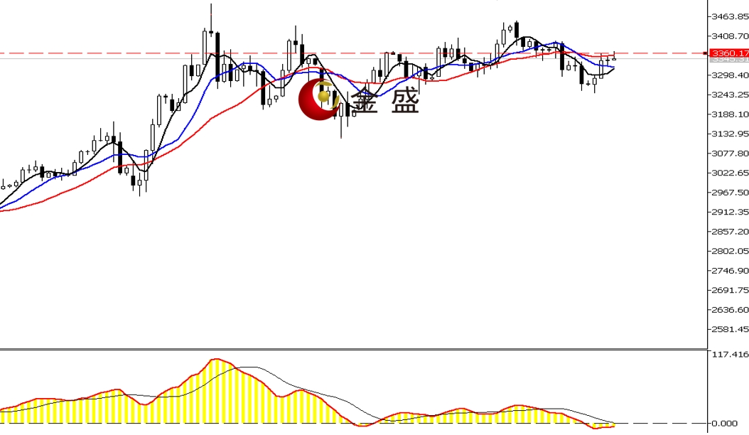 前一个交易日,白盘时段,黄金波动降低,价格围绕不足二十美金区间整理,午后创当日低点3327.47美元。晚盘时段,小非农数据意外爆冷,黄金承压3350美元一带整理,尾盘出现一波持续上行,价格最高至3360美元一带,最终再收阳。均线系统收敛走平,布林带中轨对价格上方形成阻碍。MACD指标快慢线零轴上方现死叉,做空的动能减弱。黄金连续三日收阳,K线还未出现明显反转信号。今天早盘价格短暂走高后快速调整,3350美元上方的压力依然有效,行情在非农前或继续震荡。