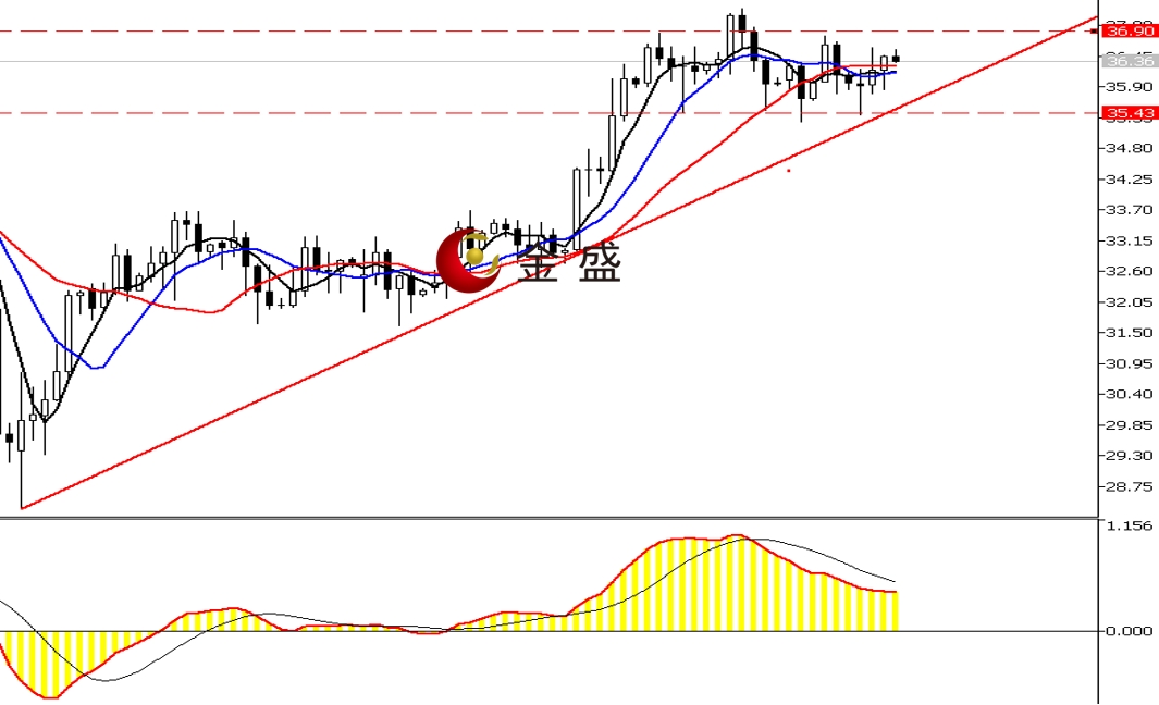 前一个交易日,白盘时段,行情承压36美元关口窄幅整理,午后创日内低点35.86美元。晚盘时段,基本面利多,美指承压走低,白银持续上行至日内高点36.57美元,日图收饱满阳线。均线系统不断收敛,价格站上布林带中轨。MACD指标快慢线零轴上方现死叉,做空的动能为主。白银涨势不变,价格运作在图示的趋势线之上。短期行情进入高位休整,形成头肩顶雏形,目前构筑右肩过程中。短期看35.5—36.5区间的震荡。