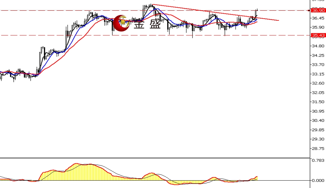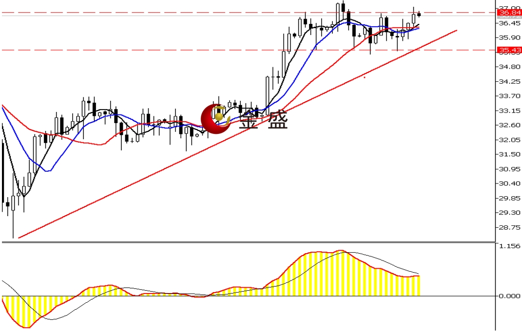 前一个交易日,白盘时段,行情承压周三高点小幅调整,创日内低点36.32美元。午后多头力度转强,价格一小时上行逾1%,盘中最高至37.06美元,晚盘时段,非农数据利空贵金属,白银一度回吐日内大部分涨幅,尾盘震荡上行,最终收阳线。均线系统不断收敛,价格站上布林带中轨。MACD指标快慢线零轴上方现死叉,做空的动能减弱。白银涨势不变,价格运作在图示的趋势线之上,短期行情进入高位区间休整。昨日价格上行至左右肩36.8美元一带,但K线并未出现明显反转信号,短期关注此压力位的真假破位。