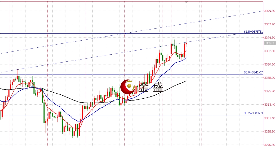 从小时图上看,K线排列两次测试亚盘冲高3374附近,该位置同时处于左侧下行肩部位置附近,从K线排列上看,K线结构并未呈现多头止步迹象,从EMA技术指标上看,目前价格受EMA的短线支撑,并以大阳线为基础展示,表示EMA系列的支撑足够强,从黄金分割技术指标上看,目前价格有动能测试黄金分割61.8压力位置3378附近,从日线级别的趋势线上看,目前价格运行在趋势线的双线下沿压制附近,表示行情的压力足够,但是需要K线的冲击配合,趋势线的压制重叠二次压制3388附近,综上所述,压制关口沿线,重点关注K线动能的减弱趋势还是上破动能增强趋势,行情若未能以大的K线进行上破,则行情需要留意上涨衰竭的信号。