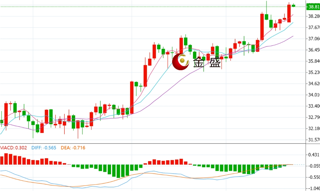 前一交易日现货白银暴涨逾2%,盘中最高触及39.03,距离上周创下的十余年高点39.11阻力不远,最终收长上影线大阳线。主要受美债收益率下跌及风险偏好回升影响,美元全线走弱推动白银价格飙升。MACD零轴上方形成金叉或持续放量,多头力量显著增强并占据主导。目前行情延续隔夜强势格局,技术形态上形成有效突破,多头趋势得到进一步确认和强化,短期内有望延续上攻动能。日内操作建议以逢低做多为主。