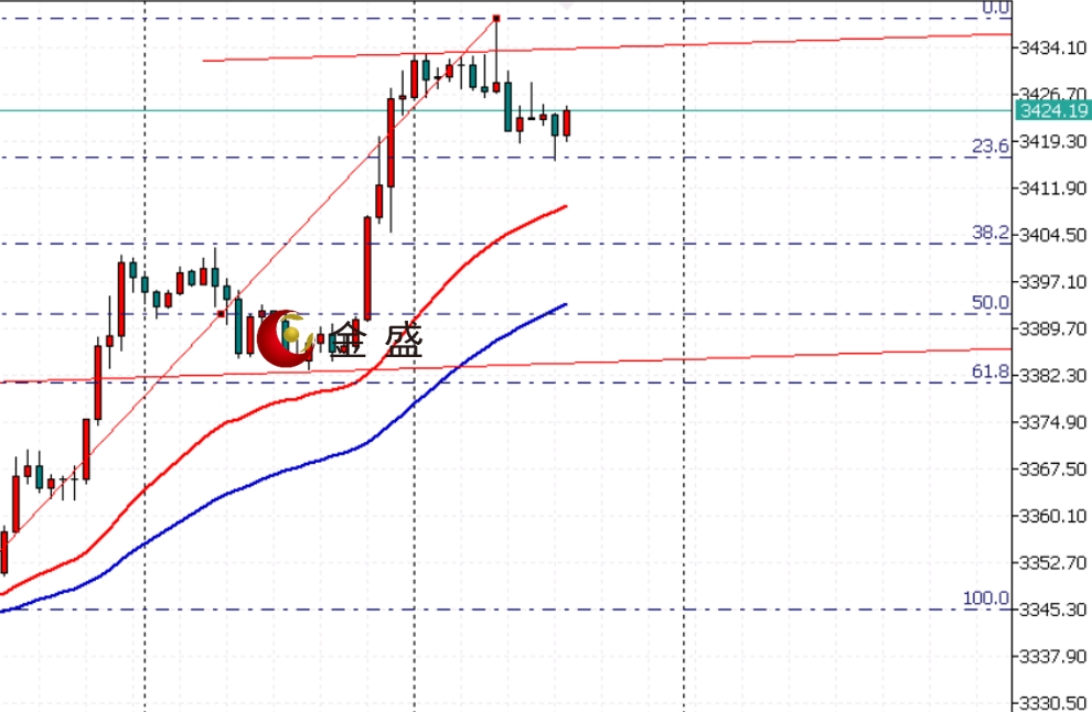 从黄金1小时图形中看,K线形态排列有冲高见顶信号的产生,K线结构自前一交易日行情上行3400美元整数关口附近后回撤3400不破,行情一举上行测试3430美元附近,亚欧盘行情延续震荡修正,在亚盘刷新高点3438美元附近后回落测试3416附近,K线在15分钟级别有企稳迹象,从K线结构上看,小时线的修正冲击以中阴线进行下行,表示结构区间上行有可能结束,接下来展开行情的回撤方向,从EMA技术指标上看,均线的发散与价格形成较远的偏离,发散缺口打开,有需求形成等待EMA技术指标的上沿或回踩EMA的需求,从黄金分割线技术指标上看,目前以短线3438美元附近作为近距离高点修正,第一循环目标23.6位置3412美元将成为今日首要修正支撑位置附近,动能K线呈修正,所以,综合上来看,今日行情有调整需求。
