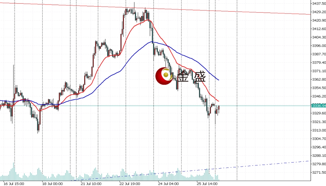 上周五(7月25日)现货黄金继续在全球贸易乐观情绪和强劲经济数据的双重压力下,连续三日下跌,盘中一度逼近3324美元/盎司的心理关口,收报3336美元附近,跌幅约1%。当地时间7月27日,特朗普宣布美国与欧盟达成框架协议,对欧盟输美商品征收15%的统一关税,同时欧盟承诺增加6000亿美元对美投资以及7500亿美元的能源和军事装备采购。这一消息提振了市场风险偏好,削弱了黄金作为避险资产的需求。今日(7月28日)亚盘开盘行情一度下行3320附近,随后行情回升3336附近,现在价格运行在3336附近。