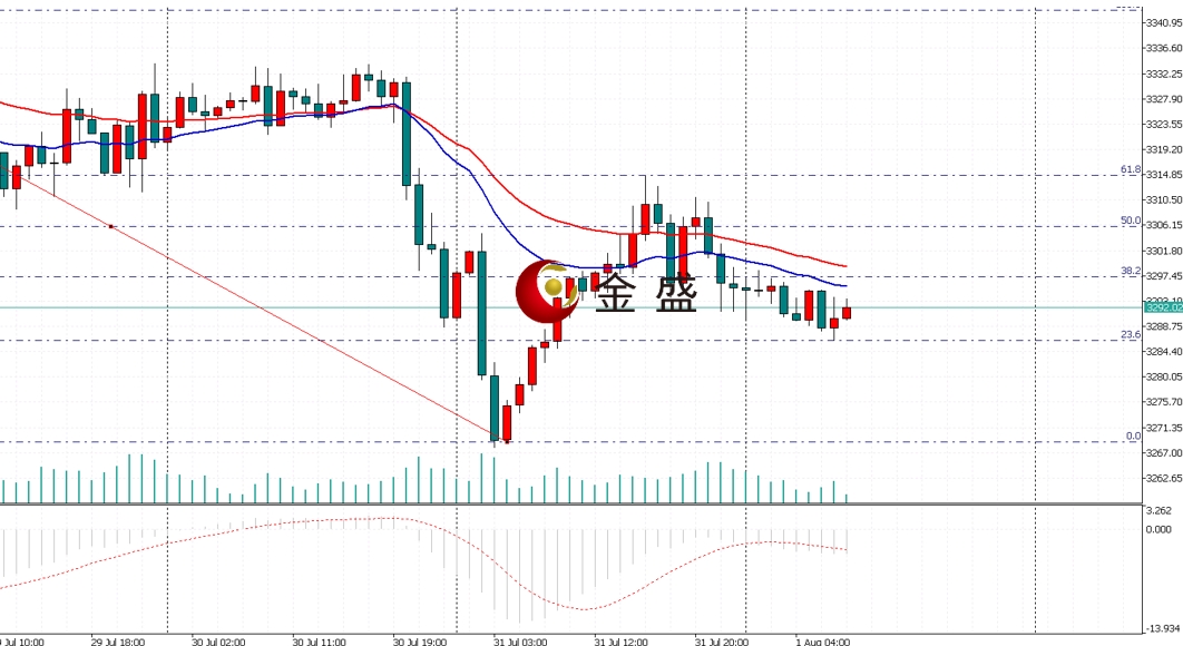 从黄金1小时图形,从K线图形中看,行情在基本面的影响之下,价格呈现窄幅型的上涨后连续性的下跌,一度测试3286/3288附近一线,目前行情运行在3290/3292附近,从EMA技术指标上看,K线运行在EMA之下,从K线形态排列上看,行情呈现急速下行之后的上扬修正之后的2度回踩,表示支撑动能存在,从MACD上看,行情运行修正小幅上行,从动能上看,动能以连续阳线震荡后,以大阳刺穿,表明行情请修正动能足够,从黄金分割上看,行情自7月28日(周一)低开回撤以来的行情回撤行情回撤61.8位置再度下行23.6位置的反弹支撑,综上所述,今日行情建议高抛之余低吸之后再高抛。