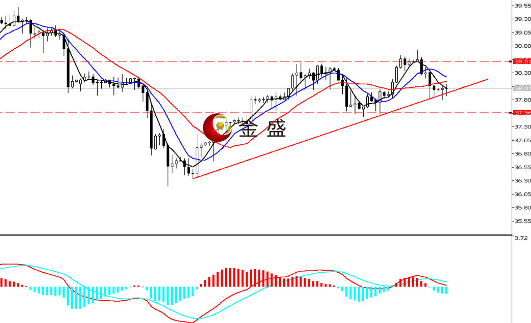 前一个交易日,白银未能延续强势上行,而是跟随黄金震荡走低,价格失守38美元关口,最终收跌1.27%。今天白盘行情依托昨日低点窄幅横盘。四小时周期,均线系统不断收敛,运行在价格上方形成阻碍。MACD指标快慢线零轴附近现死叉,做空的动能为主。白银上涨趋势不变,价格进入高位的区间震荡。7月底的上行走势形成图示的趋势线。价格回踩支撑线出现连续下影线,但K线还未确认止跌企稳,短期关注37.8美元一带的反转做多信号。