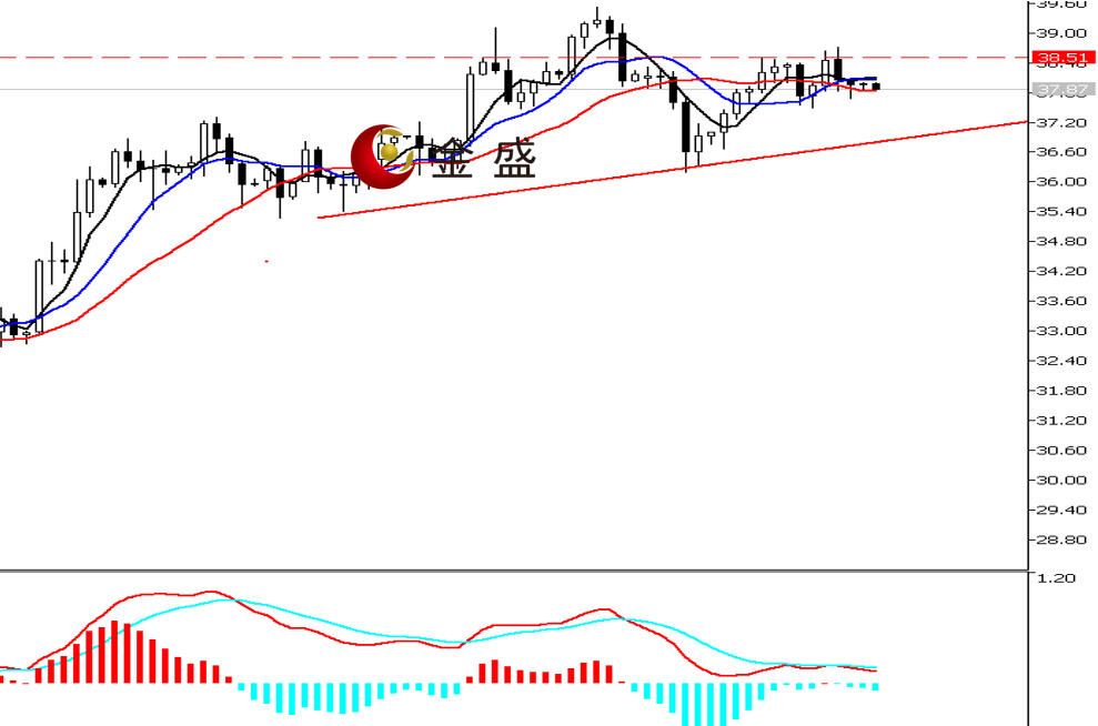 前一个交易日,早盘时段,白银承压38美元关口横盘休整,价格创当日高点38.1美元。午后行情向下打破盘整区间。晚盘时段,行情短暂下行至日内低点37.67美元,随后止跌回升。最终多头收复当日全部跌幅,日图收十字星。均线系统收敛走平,价格围绕其震荡。MACD指标快慢线零轴上方运行,做空的动能为主。白银上行趋势不变,短期进入高位的盘整,具体的震荡结构还需时间观察。日图形态左右肩结构,强化38.5美元一带的压力,短期下方关注37.5美元一带的支撑。