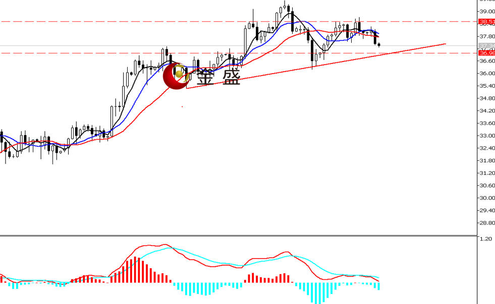 前一个交易日,白盘时段,银价受制于38美元关口走V字型震荡,盘中刷新周一低点。晚盘时段,行情单边下挫,盘中一小时走低逾1%,价格失守多个支撑,尾盘创当日低点37.26美元,最终收饱满阴线。均线系统收敛向下拐头,对价格反弹形成压制。MACD指标快慢线零轴上方运行,做空的动能为主。白银上行趋势不变,短期进入高位的盘整,震荡低点形成图示的支撑线。价格在连续十字星后出现中阴线,表明空头动能增强。短期关注37美元一带的支撑。