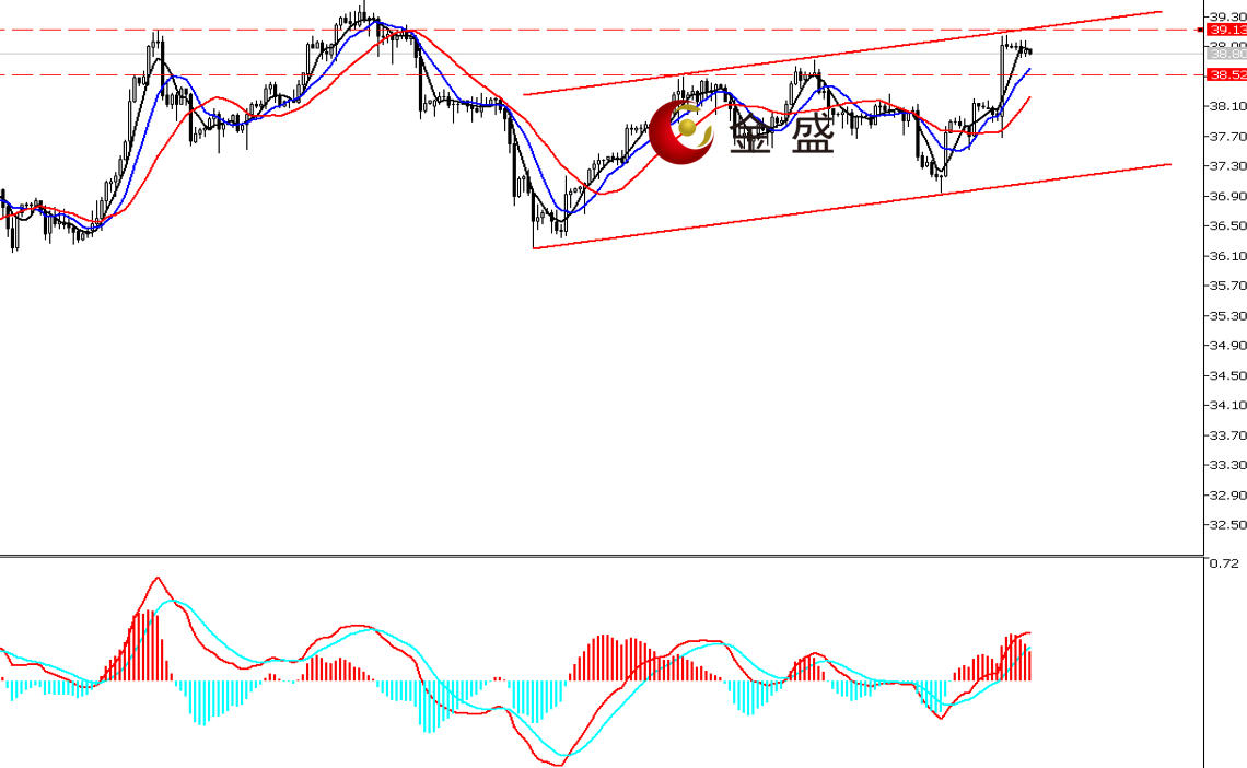 前一个交易日,金银走势同步,白银也是先跌后涨走V型反转,价格冲上39美元关口,最终收涨1.72%。今天白盘行情以休整为主,价格波动0.2美金左右。四小时周期,均线系统向上拐头,对价格形成支撑。MACD指标快慢线零轴下方现金叉,做多的动能为主。白银上涨趋势不变,短期进入高位休整。上周五大涨,今天回调幅度不大,表明多头筹码惜售。自7月底开始的走势形成图示的通道,操作上调整做多为主。