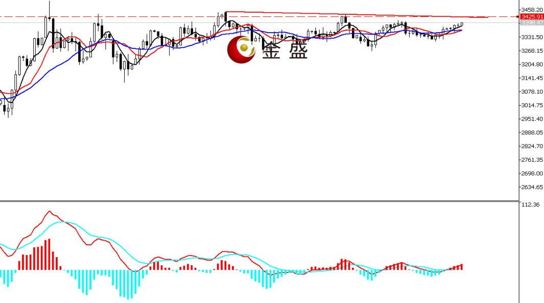 前一个交易日,白盘时段,黄金承压3390美元一带震荡下行,小时图出现一波连阴调整。午后行情进入区间盘整,价格创当日低点3373.71美元。晚盘时段,多头一小时拉升十美金,价格向上突破盘整结构,刷新日内高点至3398.56美元,最终收有下影线的阳星。均线系统收敛向上拐头,运行在价格下方形成支撑。MACD指标快慢线零轴附近现金叉,做多的动能增强。黄金连续两日上行,价格来到3400美元一带,关键位置还未出现明显承压信号。行情高位震荡逾四个月之久,短期或迎来变盘走势。结合基本面情况,行情向上突围的概率较大,操作上调整做多为主。