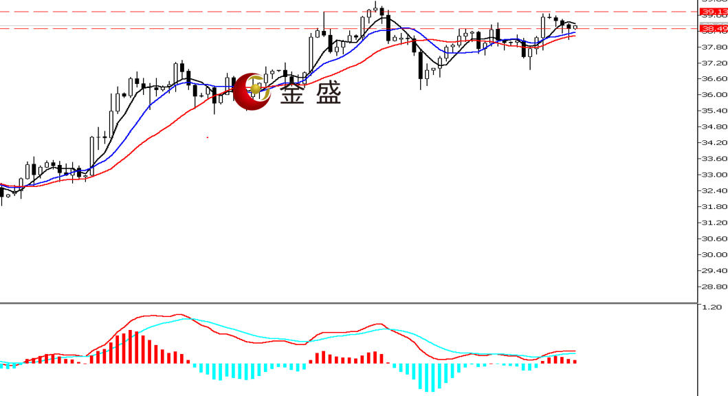 前一个交易日,白盘时段,银价延续调整,价格连续阴线下挫,午后短暂跳水至日内低点38.07美元。晚盘时段,随着美指转弱,白银以反弹为主,多头收复日内全部跌幅,最终收长下影的十字星。均线系统收敛向上拐头,运行在价格下方形成支撑。MACD指标快慢线零轴上方现金叉,做多的动能增强。白银上行趋势不变,当前进入高位的盘整。白银承压39美元一带,连续三日调整,昨日回踩布林带中轨有反扑,价格仍收于38.5美元上方,即第一支撑位还未有效失守,操作上调整做多为主。