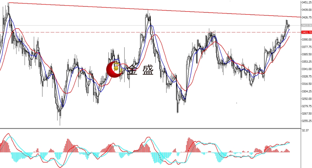 前一个交易日,美国GDP和初请数据均好于预期,但难阻美指震荡下行收阴。黄金延续V型走势,晚盘强势突破3400美元关口,最终收涨0.58%,价格连续三日收阳。今天日内行情以休整为主,但盘中回调幅度不大。四小时周期,均线系统向上拐头,对金价形成支撑。MACD指标快慢线零轴上方运行,做多的动能减弱。黄金涨势延续,价格完成U型结构的突围,后市需要回踩,以确认突破的有效性。行情继续上行将面临3430美元一带的压力,指标有顶背离信号。短期关注3400—3430区间如何打破。操作上调整做多为主。