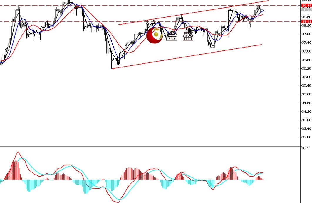 前一个交易日,白银表现偏强,价格持续上行至39美元一带,,最终收涨1.18%。今天日内行情有所调整,走势属于大涨后的技术性休整。四小时周期,均线系统收敛向上拐头,对价格上行构成支撑。MACD指标快慢线零轴上方运行,做多的动能衰竭。白银上涨趋势不变,短期进入高位休整。近期走势形成图示的通道结构,昨日一天的上行,收复之前三日的调整空间,可见白银在区间内震荡偏强。短期关注通道上轨的真假突破,操作上调整做多为主。