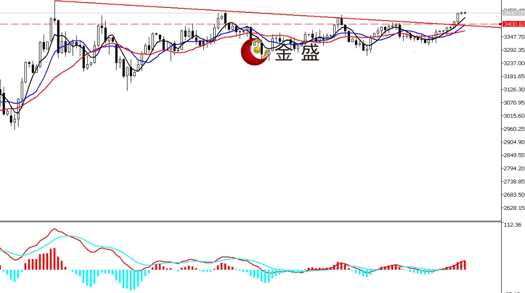 前一个交易日,白盘时段,黄金技术性调整,午后创当日低点3404.23美元。晚盘时段,行情持续阳线拉升,价格突破多个关口,尾盘创当日高点3453.73美元,日图收中阳线。均线系统收敛向上拐头,运行在价格下方形成支撑。MACD指标快慢线零轴附近现金叉,做多的动能增强。黄金连续四日收阳,价格出现加速走高现象。多头突破图示的压力线,后市将测试前高3500美元一带。3400美元附近形成强支撑区。上周五大涨,今天偏向休整。操作上调整做多为主。
