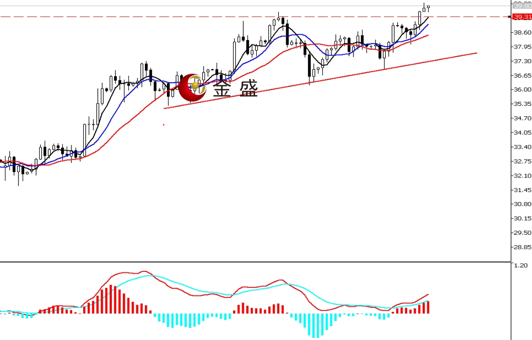 前一个交易日,白盘时段,银价承压39美元关口有所调整,午后进入区间横盘整理。晚盘时段,价格探底38.7美元止跌转涨,小时图连续大阳线拉升,价格逼近40美元大关,尾盘回吐部分涨幅,最终收中阳线。均线系统收敛向上拐头,运行在价格下方形成支撑。MACD指标快慢线零轴上方现金叉,做多的动能为主。白银上行趋势不变,价格刷新年内新高。月线反包前一个月的流星线,后市将还有高点,操作上调整做多为主。