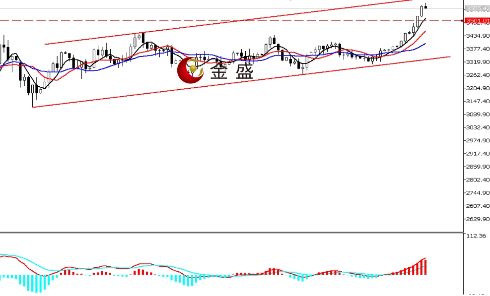 前一个交易日,白盘时段,黄金围绕3540美元关口横盘整理,价格创当日低点3526.29美元。午后价格重心有所上移。晚盘时段,黄金再次出现单边上涨,价格接连打破3560、3570关口,尾盘创当日高点3578.19美元,最终收阳线。均线系统多头排列,运行在价格下方形成支撑。MACD指标快慢线零轴附近现金叉,做多的动能增强。黄金日图七连阳,多头维持强势状态。行情走势形态图示的通道,K线还无明显承压信号。金价短期涨幅偏大,谨防回调风险,下方看3540美元一带的支撑。