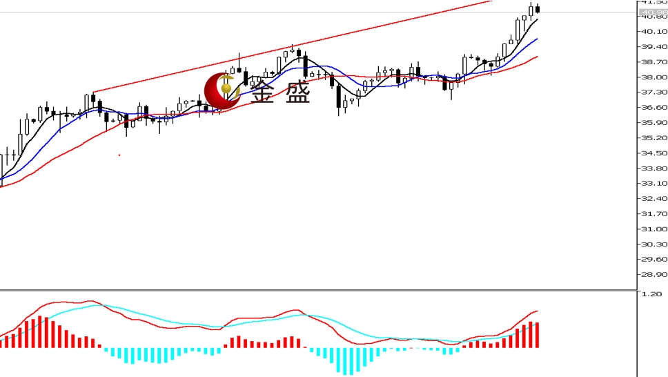 前一个交易日,白盘时段,银价小幅调整至当日低点40.62美元,午后拐头震荡上行。晚盘时段,多空分歧加剧,价格一小时拉升1%,价格创日内高点41.45美元,但最终收流星线,尾盘有所调整,最终收小阳线。均线系统多头排列,运行在价格下方形成支撑。MACD指标快慢线零轴上方现金叉,做多的动能为主。白银日图五连阳,价格站上41美元大关。价格逼近月线U型底水平口压力42美元一带,短期高位波动或加剧。操作上调整做多为主,博空需等待信号。