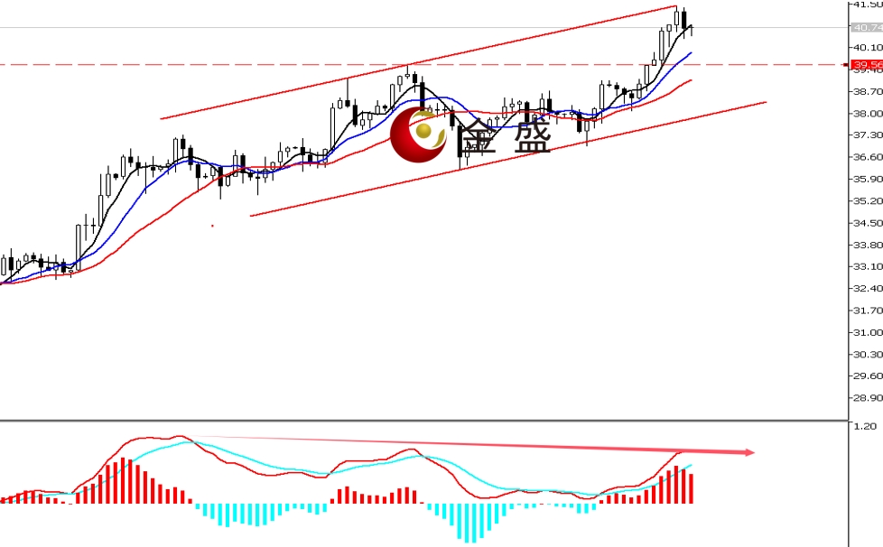 前一个交易日,白盘时段,银价延续调整,开市即创当日高点41.21美元。亚盘跟随黄金短暂跳水,午后持续反扑收复早盘大部分跌幅。晚盘时段,行情延续下行,盘中一小时走低1%,价格创当日低点40.39美元,最终收阴线。均线系统多头排列,运行在价格下方形成支撑。MACD指标快慢线零轴上方现金叉,做多的动能为主。白银高位调整收阴,日图形成阴包阳结构,且指标也出现超买现象,技术面暂时有利于空头。短期价格不能强势站上41美元大关,则偏向调整加大,操作上反弹做空为主。