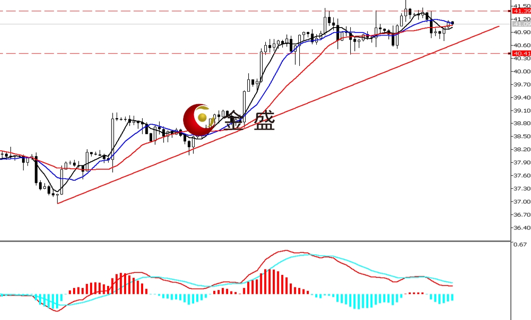 前一个交易日,白银表现偏弱,价格承压区间上轨震荡下行,多头回吐周一全部涨幅,最终收跌1.13%。今天日内行情以反弹为主,午后价格重返41美元上方。四小时周期,均线系统不断收敛,价格围绕其震荡。MACD指标快慢线零轴附近现死叉,做空的动能减弱。白银上涨趋势不变,价格依然运行在图示支撑线之上。近期行情进入40.4—41.4的横盘区间,多空震荡逾一周的时间,短期盘口可能选择突破方向。未确认突破前,操作上围绕区间上下轨高抛低吸。