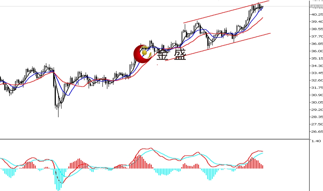 前一个交易日,白盘时段,银价短暂下挫创当日低点40.7美元,随后拐头上行。欧美盘时段,行情波动平稳,价格围绕41美元关口窄幅整理,盘中最高至41.27美元,最终收阳线。均线系统多头排列,短期均线支撑价格上行。MACD指标快慢线零轴上方现金叉,做多的动能减弱。白银形成图示的上行通道,当前受制于上轨压力盘整。K线阴阳线交替出现,市场走势方向待定。指标未跟随价格同步上行,这是多头的隐忧。多头不能强势向上突破通道,则容易确认顶背离,价格或迎来调整。操作上高抛低吸。