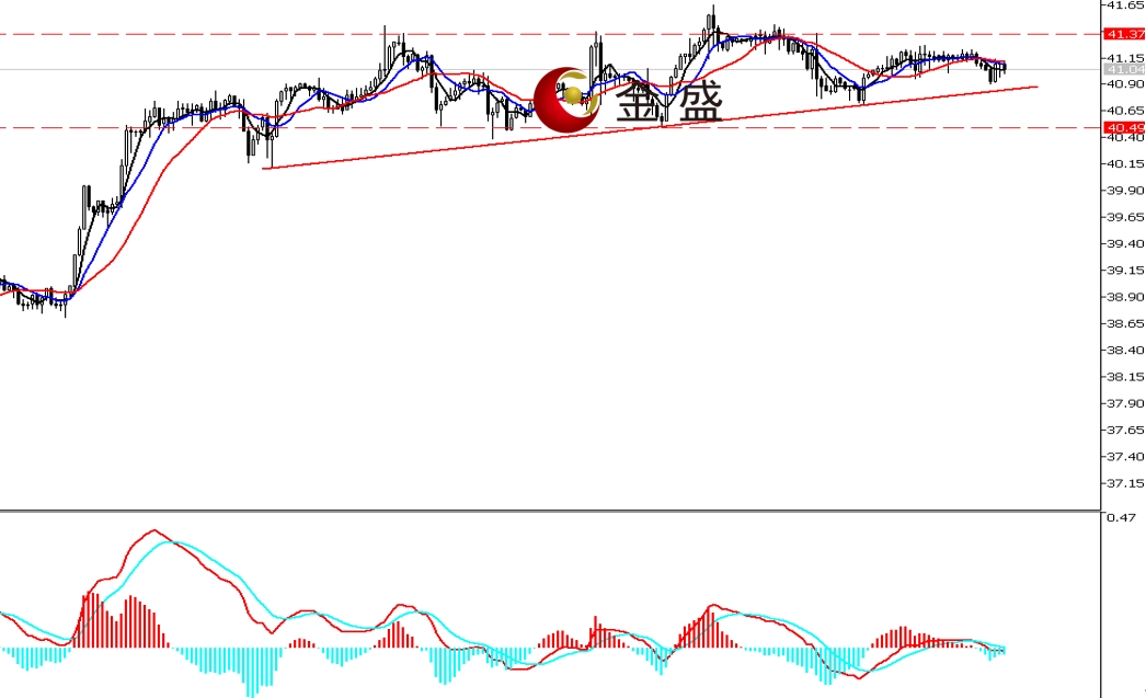 前一个交易日,白银延续区间盘整,多空围绕41美元一带争夺,最终收涨0.57%。今天白银的行情波动进一步收窄。小时周期,均线系统不断收敛,价格围绕其震荡。MACD指标快慢线零轴附近现死叉,做空的动能减弱。白银上涨趋势不变,价格围绕图示40.4—41.4的区间盘整多日,且价格低点形成上行支撑线,即价格在区间内震荡在逐渐增强。短期等待市场选择突破方向,操作上高抛为主。