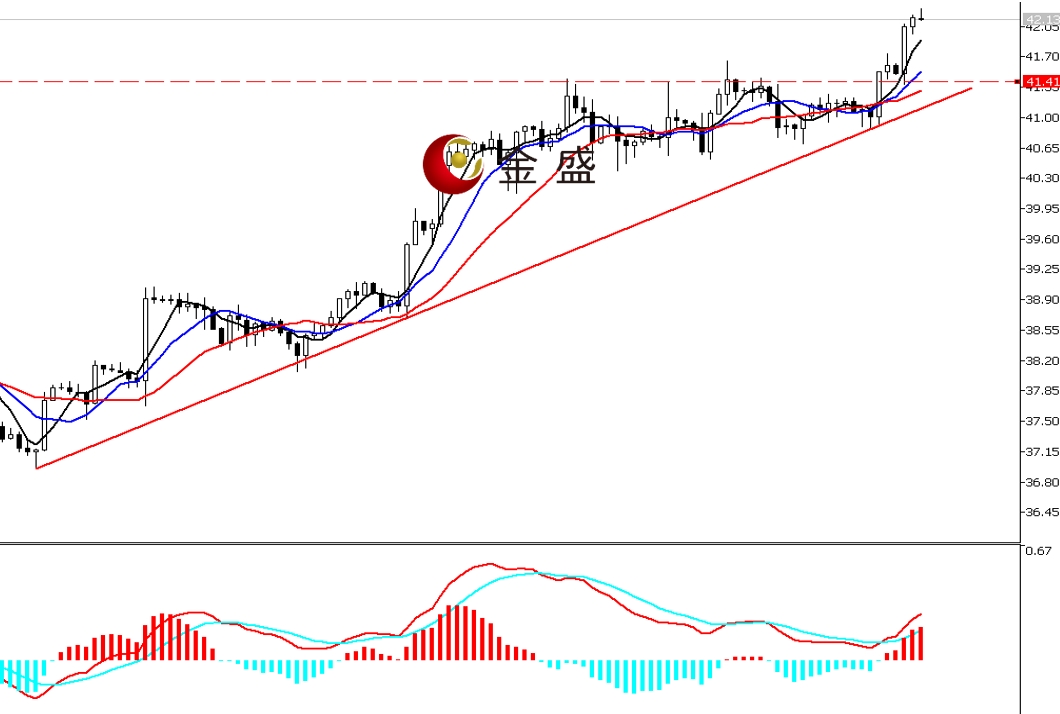 前一个交易日,金银分化明显,银价白盘围绕41美元关口震荡,晚盘出现强势拉升创周内新高,最终收涨0.93%。今天白盘行情延续涨势,早盘一小时拉升逾1%,价格突破42美元大关。四小时周期,均线系统多头排列,对价格上涨形成支撑。MACD指标快慢线零轴附近现金叉,做多的动能增强。白银上涨趋势不变,价格突破近期横盘结构,上行空间再度打开。午后行情日内涨幅约2%,多头动能强劲,短期关注42.5美元一带的压力。