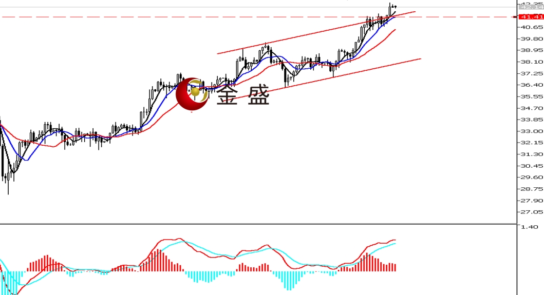 前一个交易日,白盘时段,银价依托41.4美元关口震荡上行,早盘一小时拉升逾1%的涨幅,多头强势突破42美元大关,午后创当日高点42.45美元。晚盘时段,多空围绕42美元关口争夺,日图形成三连阳。均线系统多头排列,短期均线支撑价格上行。MACD指标快慢线零轴上方现金叉,做多的动能减弱。白银上涨趋势不变,多头突破逾一周的盘整区间,也突破了通道上轨的压制,后市空间再度打开。41.4美元关口形成第一支撑区,操作上调整做多为主。