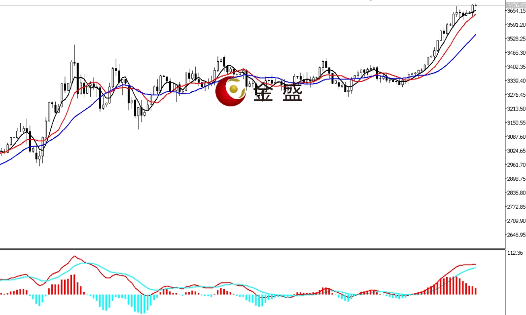 前一个交易日,早盘时段,黄金短暂快速回撤至日内低点3626.49美元,随后出现V型反转。午盘多空围绕3640美元关口横盘休整。晚盘时段,多头蓄势突破盘整区间,盘中一小时上行二十美金,价格最高至3685.33美元,日图收中阳线。均线系统多头排列,价格依托五周期均线上行。MACD指标快慢线零轴附近现金叉,做多的动能为主减弱。昨日黄金突破上周盘整结构,一根中阳线吞没多根休整K线,价格再创历史新高。多头势能依然强劲,后市看3700美元关口的压力反应。