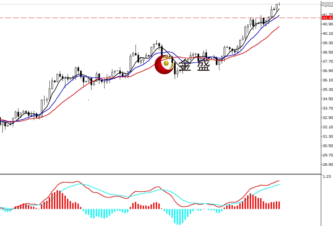 前一个交易日,白盘时段,银价坚守42美元关口横盘休整。晚盘时段,随着黄金不断走高,白银突破日内震荡区间,一小时走高0.3美金,尾盘创当日高点42.73美元,最终收饱满阳线。均线系统多头排列,短期均线支撑价格上行。MACD指标快慢线零轴上方现金叉,做多的动能减弱。白银上涨趋势不变,日图形成四连阳,且K线实体并未明显收窄,即多头力度依然强劲,后市看43美元一带的压力,操作上调整做多为主。