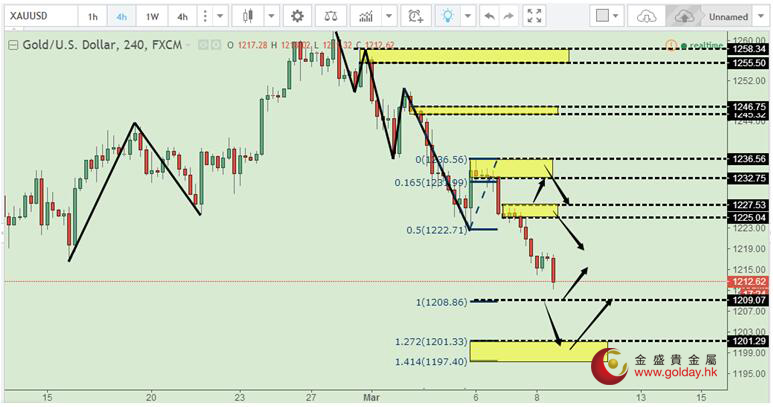 现货黄金周三(3月8日)亚盘和欧盘进一步持续震荡走低,触及2月3日以来最低至1213.3美元/盎司,但仍然暂无止跌企稳形态。下方关注1109和1200美元/盎司附近的支撑,获得支撑可以考虑做多,但是目前趋势向下,建议反抽做空为主。上方如果反抽关注1225-1227、1239-1236和1245-1247美元/盎司的区间,获得阻力可以做空。